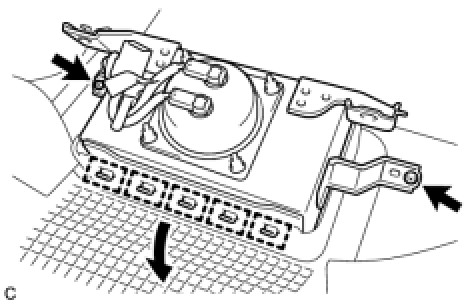 (c) Disengage the 5 hooks to remove the front passenger airbag assembly from the instrument panel safety pad assembly as shown in the illustration.