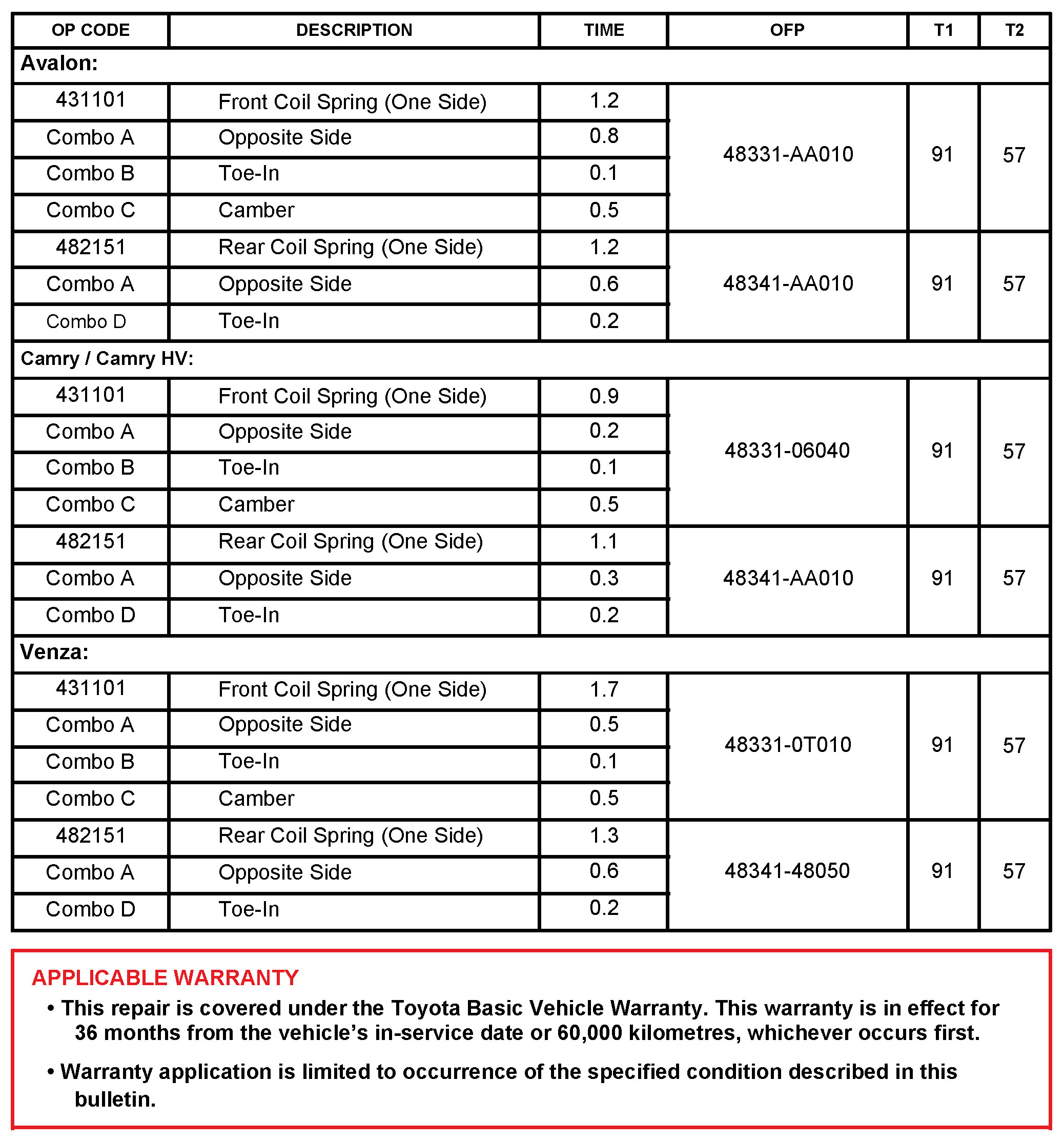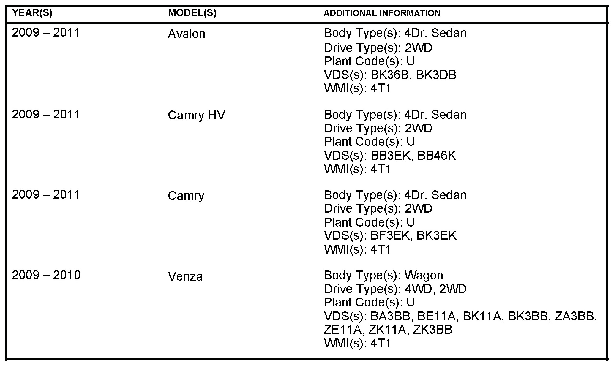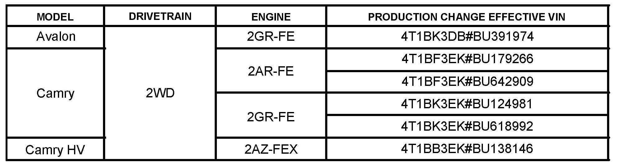 - 2009 - 2011 model year Avalon, Camry, and Camry HV vehicles produced BEFORE the Production Change Effective VINs shown.