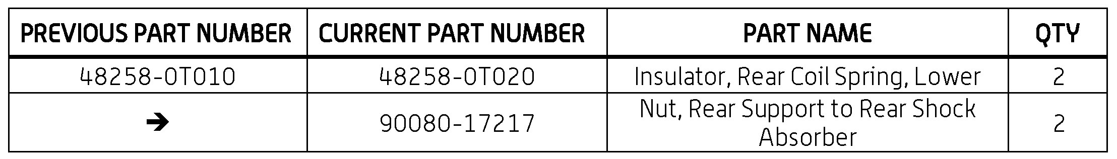 Some 2009 - 2010 Venza vehicles may exhibit a "squawk/groan" noise from the rear suspension when traveling over bumps, accelerating from a stop, and/or during slow rolling stops. The abnormal noise may be caused by rear coil spring contact with the lower strut seat due to a displaced or damaged rear coil spring lower insulator. An updated rear coil spring lower insulator is available for this condition.