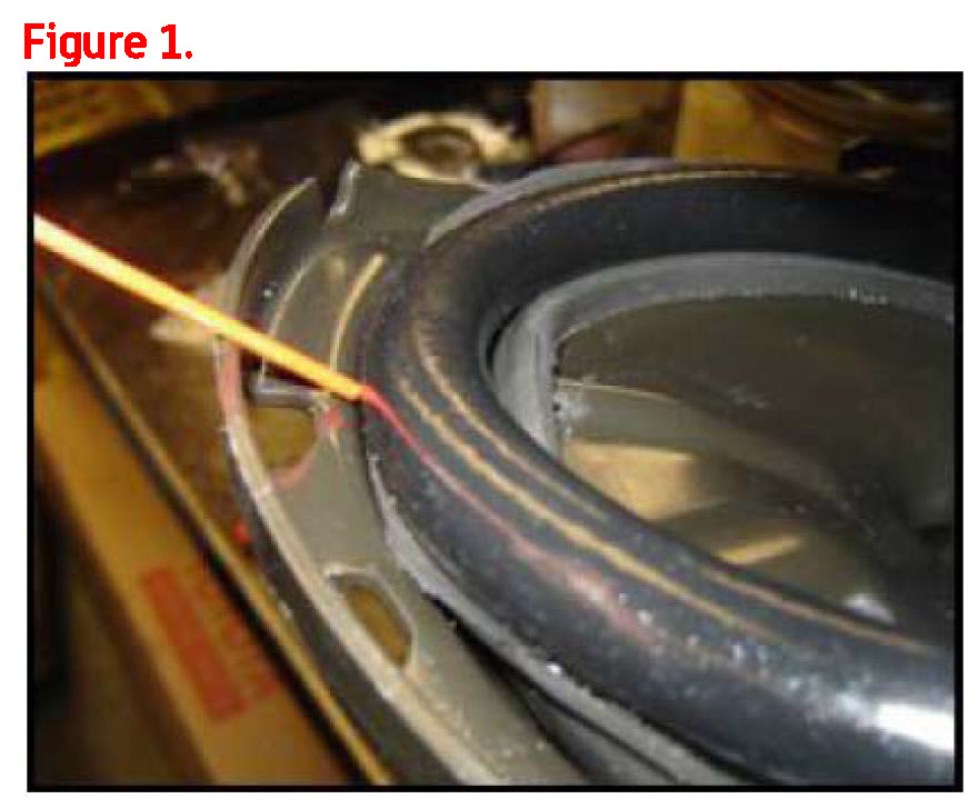 1. Verify the rear coil spring lower insulator is displaced or damaged as shown in Figure 1.