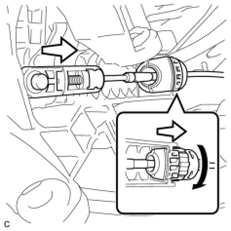 (h) Turn the lock nut of the transmission control cable counterclockwise. While holding the lock nut, push in the stopper.