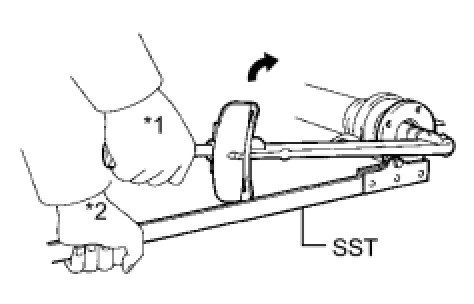 (d) Using SST to hold the universal joint flange, press the No. 1 center support bearing assembly into position by tightening a new nut and washer.