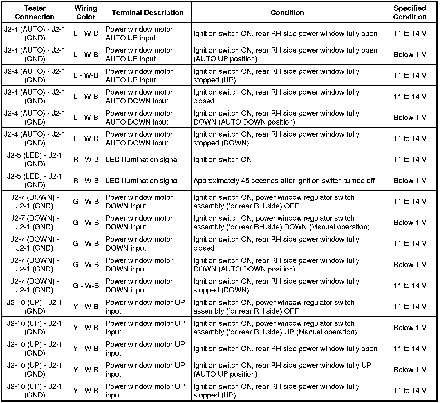 (f) If the result is not as specified, the power window regulator master switch assembly may have a malfunction.