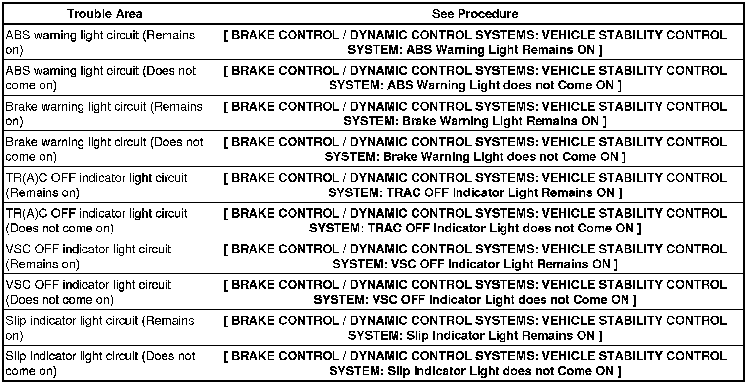* If any of the indicators remains on or does not come on, proceed to troubleshooting for the light circuits listed below.
