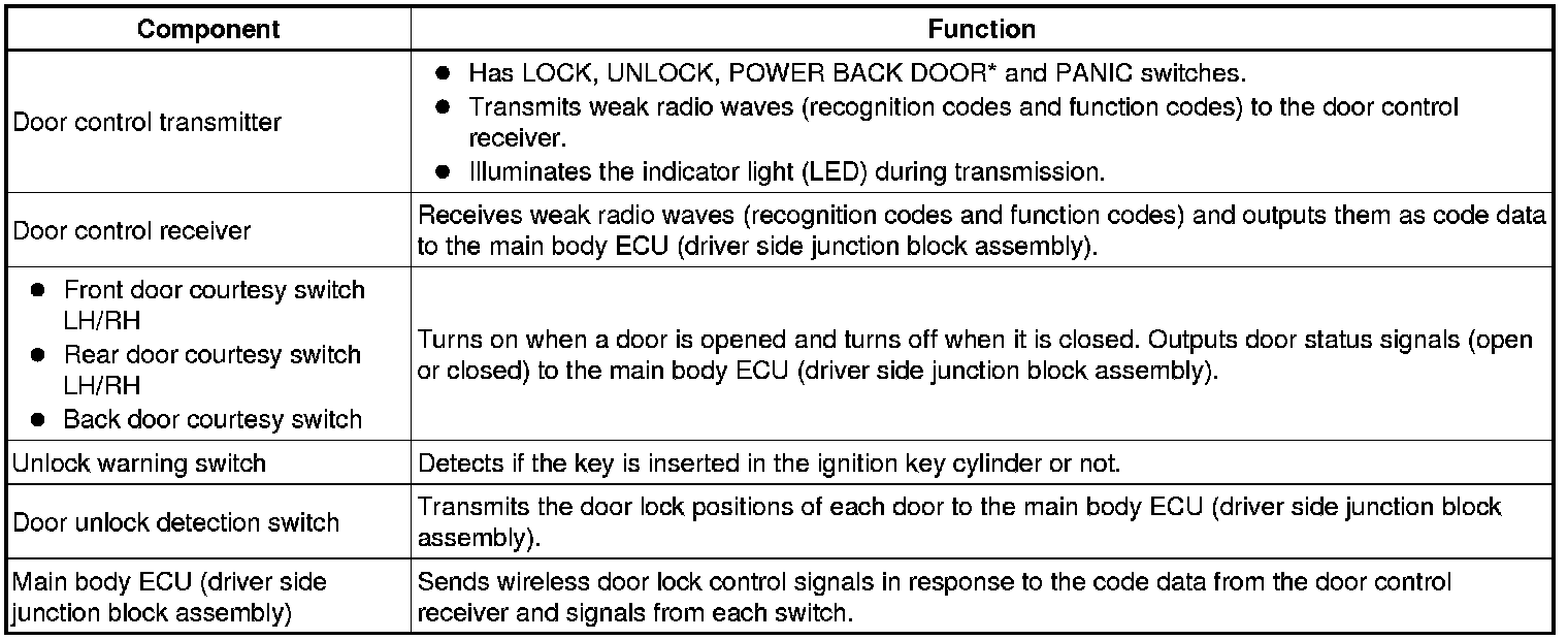 The door control transmitter has the LOCK, UNLOCK, POWER BACK DOOR* and PANIC switches. Operating these switches activates each function.
