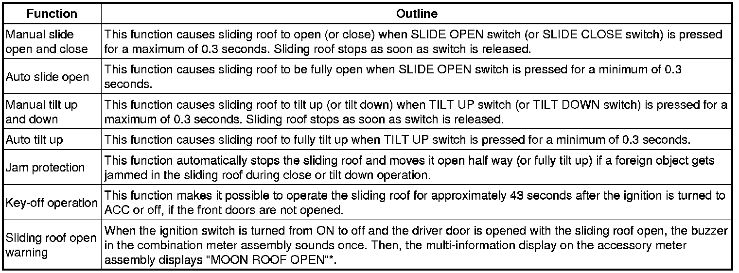 This system has the following functions: manual slide open and close; auto slide open; manual tilt up and down; auto tilt up; jam protection; key off operation.