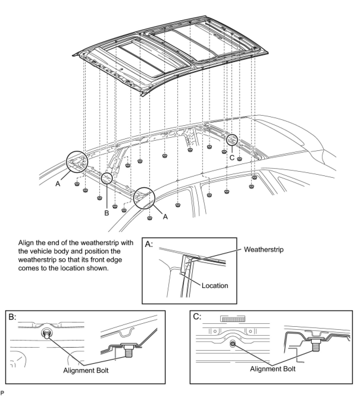 (b) After adjusting the No. 3 sliding roof glass sub-assembly, fully tighten the 18 nuts to install the sliding roof housing panel.