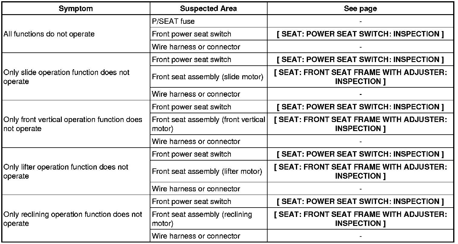 SEAT: FRONT POWER SEAT CONTROL SYSTEM: PROBLEM SYMPTOMS TABLE
