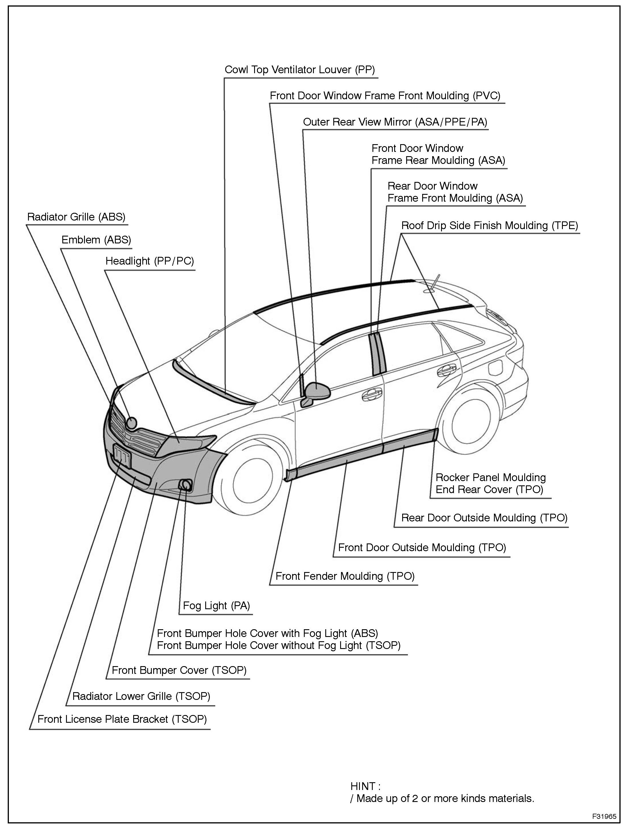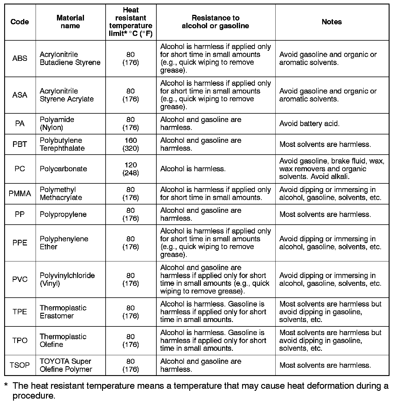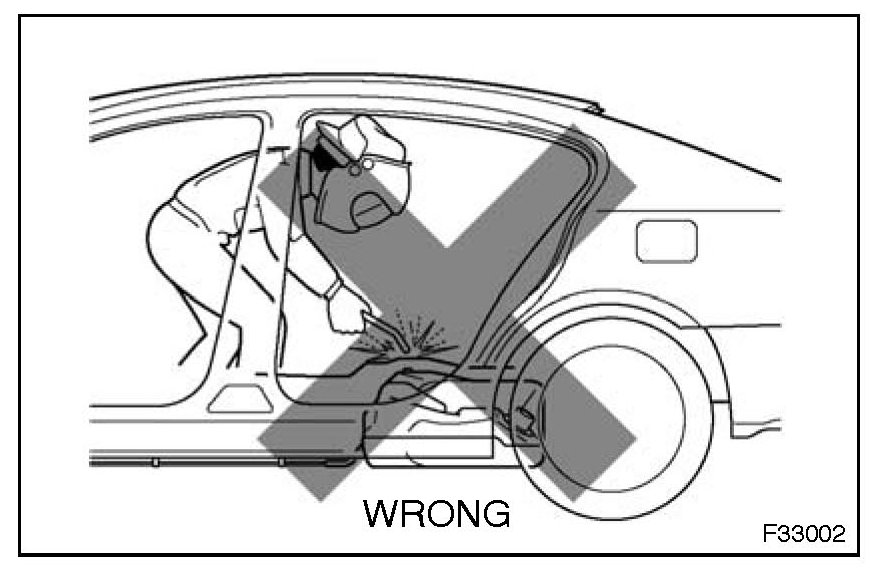 1. Rustproof high strength steel sheets are used for the body frame. Therefore, if these parts are heat repaired using an acetylene torch or equivalent, the crystalline structure changes, causing the strength of the steel sheets to decrease. Also, the zinc coating which is used to protect the body from rust will be damaged. This causes the surface of the steel sheets to become oxidized, which reduces their ability to resist rust.