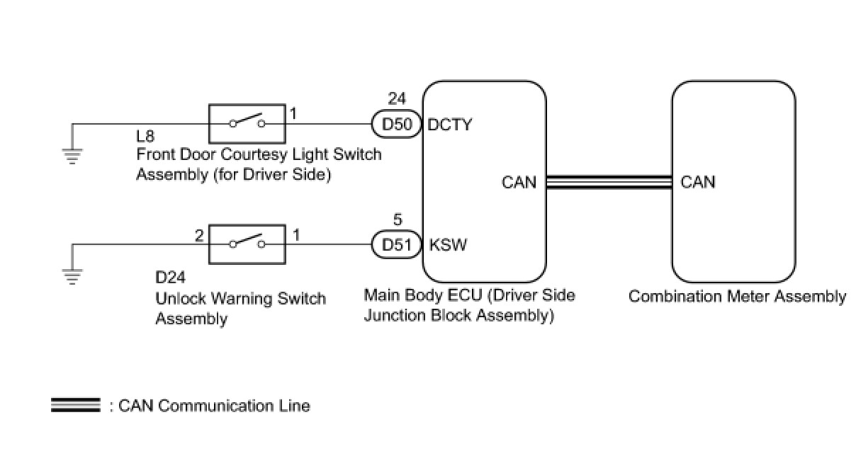 The key reminder warning buzzer sounds when the driver side door is opened while the ignition switch is in LOCK or ACC. The key reminder warning buzzer is activated when the main body ECU (driver side junction block assembly) sends an unlock warning switch signal and driver side door courtesy light switch signal to the combination meter assembly via CAN communication.