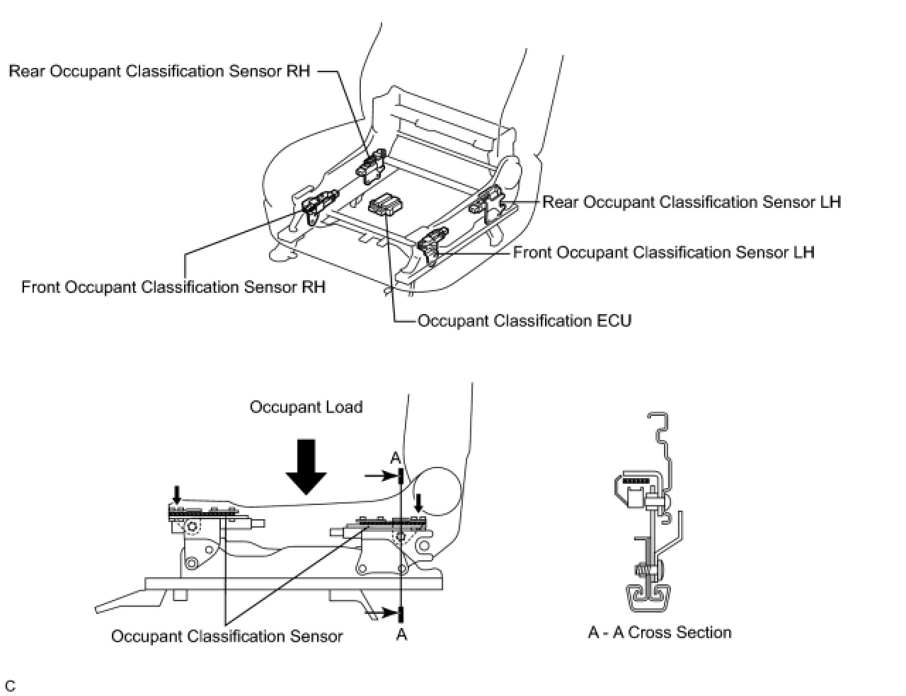 (1) The occupant classification sensors are installed on 4 brackets connecting the seat rail and seat frame. Accordingly, when load is applied to the front passenger seat by an occupant sitting in it, the occupant classification sensors register a distortion.