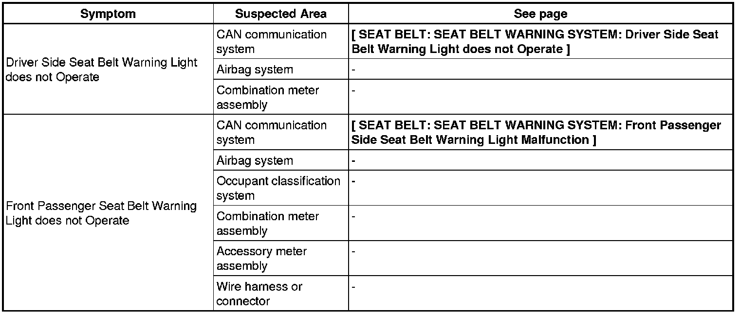 SEAT BELT: SEAT BELT WARNING SYSTEM: PROBLEM SYMPTOMS TABLE