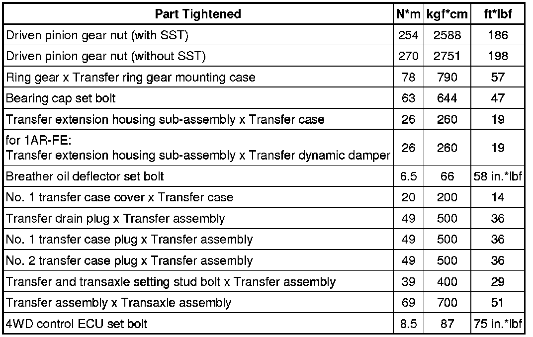 SPECIFICATIONS: MF1A TRANSFER / 4WD / AWD: TORQUE SPECIFICATIONS