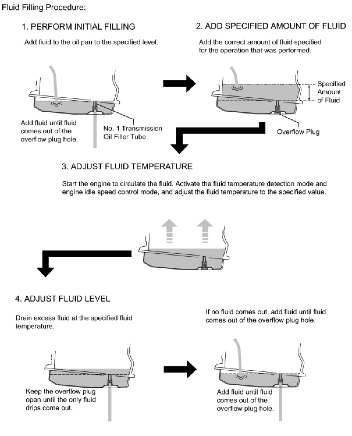 * If ATF comes out, it is not necessary to perform the initial filling procedure. After checking the tightening torque of the No. 1 transmission oil filler tube, temporarily tighten the overflow plug.