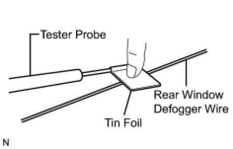 (d) Place a positive (+) lead of the voltmeter against the rear window defogger wire on the battery side.