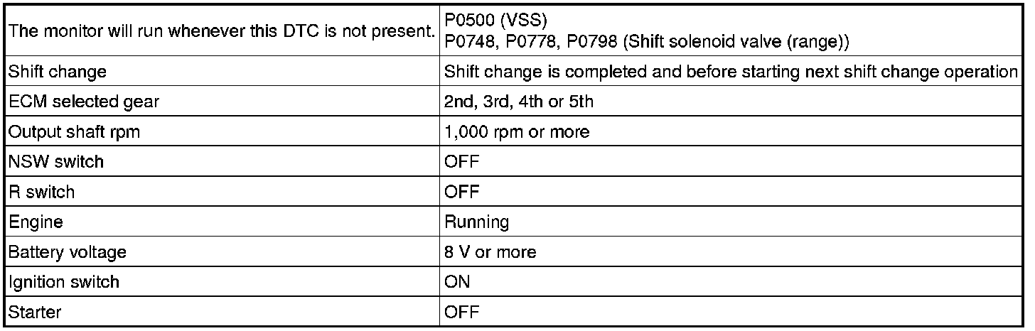 While the vehicle is operating in 2nd, 3rd, 4th or 5th gear in the shift position of D, if the input shaft revolution is less than 300 rpm *1although the output shaft revolution is more than 1,000 rpm *2, the ECM detects the trouble, illuminates the MIL and stores the DTC.