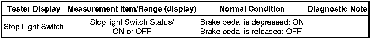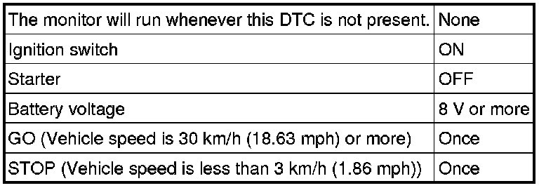 This DTC indicates that the stop light switch remains on. When the stop light switch remains ON during "stop and go" driving, the ECM interprets this as a fault in the stop light switch and the MIL comes on and the ECM stores the DTC. The vehicle must stop (less than 3 km/h (2 mph)) and go (30 km/h (19 mph) or more) 5 times for two driving cycles in order to detect a malfunction.