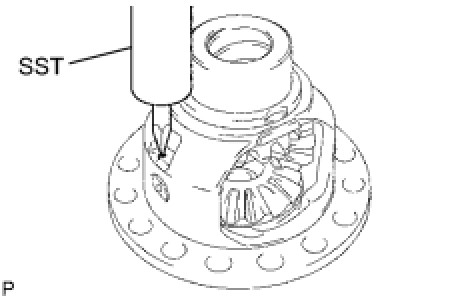 (a) Using SST and a hammer, unstake the staked part of the front differential case.