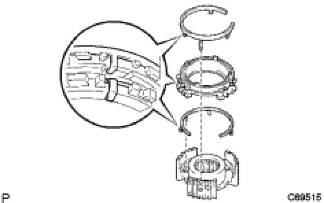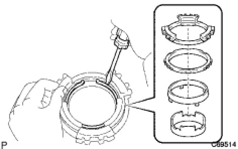 (a) Install the No. 5 synchronizer ring middle, No. 5 synchronizer ring outer, and synchronizer pull ring to the No. 5 synchronizer ring inner. Using a screwdriver, secure them with the snap ring.
