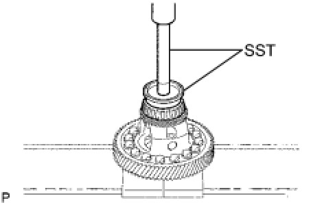 (c) Using SST and a press, install the front differential case rear tapered roller bearing (inner race).