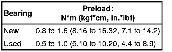 The preload of all the output shaft rear bearing shims varies in torque from about 0.04 to 0.06 N*m (0.408 to 0.612 kgf*cm, 0.35 to 0.53 in.*lbf).