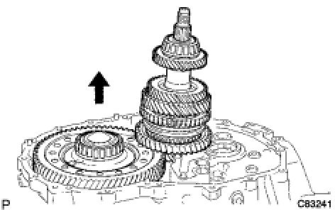 (b) Lift the differential case assembly with the output shaft assembly leaned, and install it to the manual transaxle case.