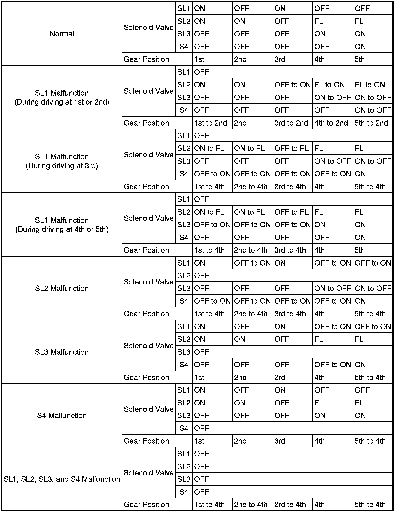 If either of the shift solenoid valve circuits develops an open or short, the ECM turns the other shift solenoid "ON" and "OFF" in order to shift into the gear positions shown in the table below.