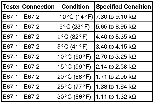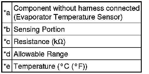 The evaporator temperature sensor (A/C thermistor) is installed on the evaporator in the air conditioning unit. It detects the temperature of the cooled air passed through the evaporator and its signal sent to the A/C amplifier is used to control the air conditioning. The resistance of the evaporator temperature sensor (A/C thermistor) changes in accordance with the temperature of the cooled air passed through the evaporator. As the temperature decreases, the resistance increases. As the temperature increases, the resistance decreases.