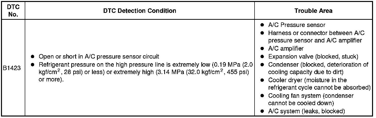 This DTC is output when refrigerant pressure on the high pressure side is extremely low (0.19 MPa (2.0 kgf/cm2, 28 psi) or less) or extremely high (3.14 MPa (32.0 kgf/cm2, 455 psi) or more). The A/C pressure sensor, installed on the high pressure line to detect refrigerant pressure, outputs a refrigerant pressure signal to the A/C amplifier. The A/C amplifier converts this signal to a pressure value according to the sensor characteristics to control the compressor.