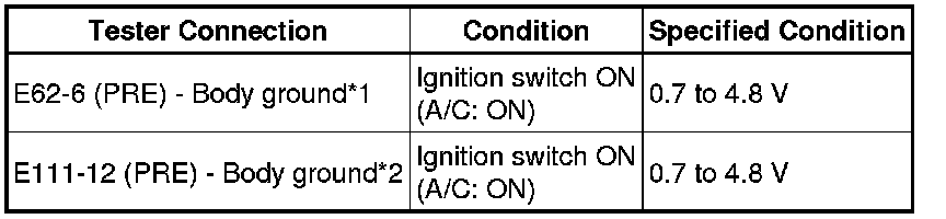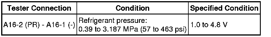 * If refrigerant pressure on the high pressure line becomes extremely high during the inspection (if the voltage exceeds 4.8 V), the fail-safe function stops compressor operation. Therefore, measure the voltage before the fail-safe function operates.