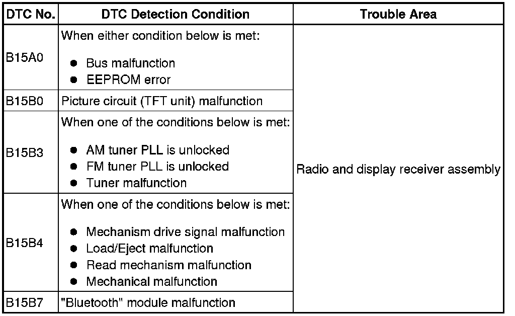 These DTCs are stored when a malfunction occurs in the radio and display receiver assembly.