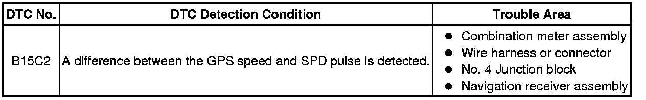 The navigation receiver assembly stores this DTC when the difference between the speed information that the navigation antenna assembly receives and the SPD pulse received from the combination meter assembly becomes large.