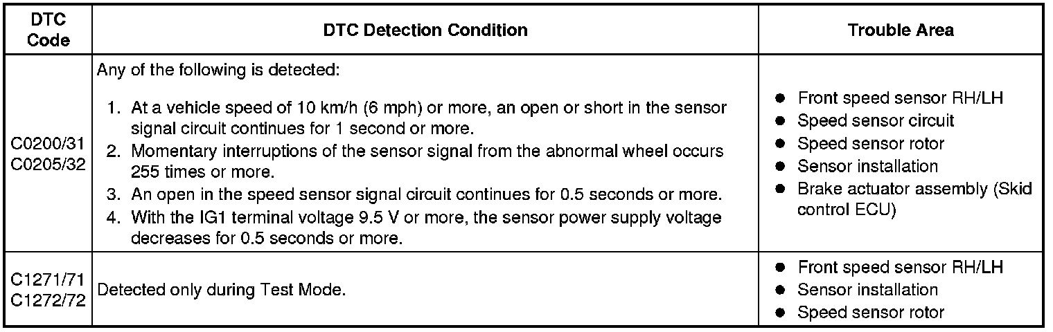 * DTCs C0200/31 and C1271/71 are for the front speed sensor RH.