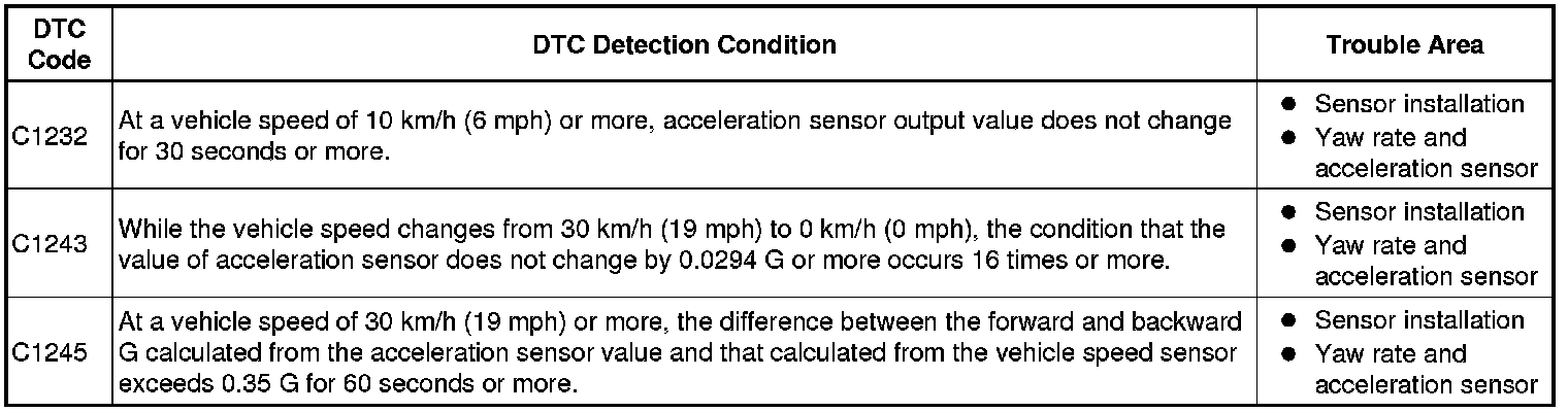 BRAKE CONTROL / DYNAMIC CONTROL SYSTEMS: VEHICLE STABILITY CONTROL SYSTEM: C1232, C1243, C1245; Acceleration Sensor Stuck Malfunction; 2013 MY Corolla [07/2012 -]