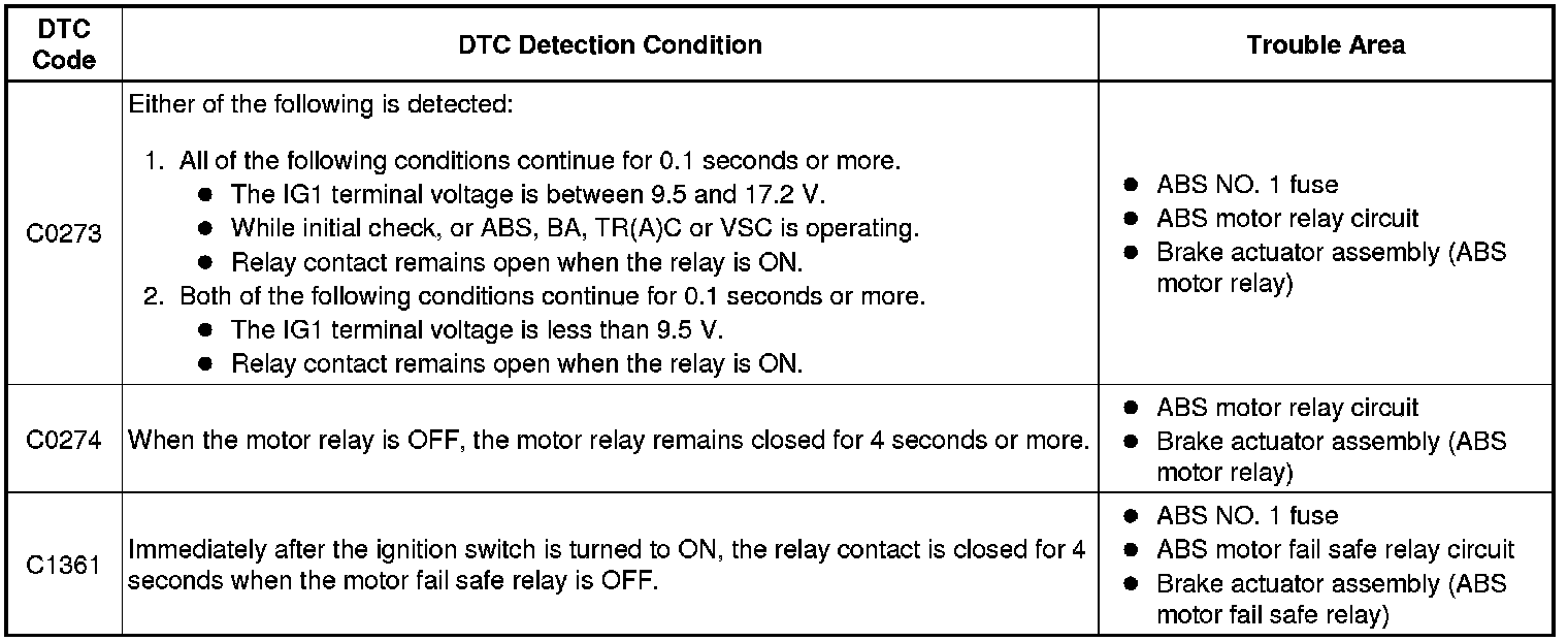 BRAKE CONTROL / DYNAMIC CONTROL SYSTEMS: VEHICLE STABILITY CONTROL SYSTEM: C0273, C0274, C1361; Open in ABS Motor Relay Circuit; 2013 MY Corolla [07/2012 -]