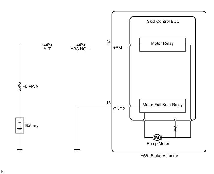 The ABS motor relay supplies power to the ABS pump motor. While the ABS is activated, the ECU turns the motor relay on and operates the ABS pump motor.