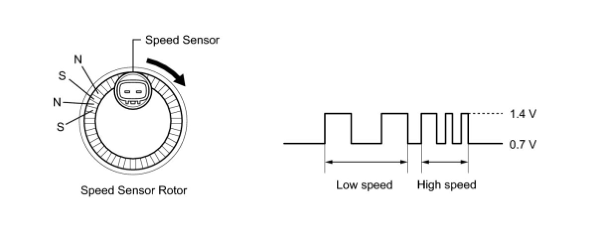 Speed sensor rotors have rows of alternating N and S magnetic poles. The hall IC type speed sensor uses the frequency of output pulses to detect the vehicle speed. Because the sensor outputs digital pulses, it can detect vehicle speeds even when the vehicle is nearly stationary.