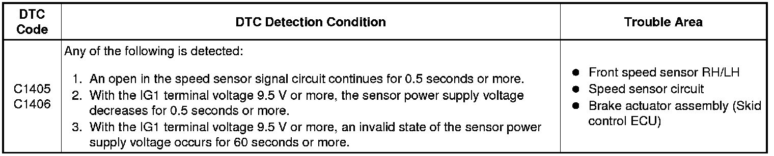 BRAKE CONTROL / DYNAMIC CONTROL SYSTEMS: VEHICLE STABILITY CONTROL SYSTEM: C1405, C1406; Open or Short in Front Speed Sensor RH Circuit; 2013 MY Corolla [07/2012 -]