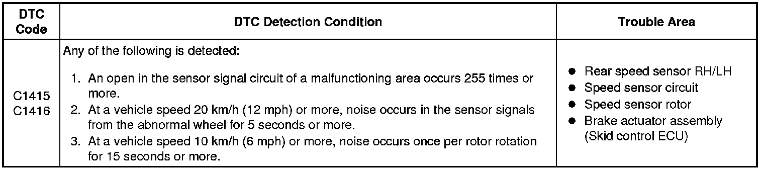 BRAKE CONTROL / DYNAMIC CONTROL SYSTEMS: VEHICLE STABILITY CONTROL SYSTEM: C1415, C1416; Rear Speed Sensor RH Output Malfunction; 2013 MY Corolla [07/2012 -]