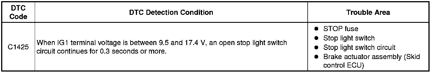 BRAKE CONTROL / DYNAMIC CONTROL SYSTEMS: VEHICLE STABILITY CONTROL SYSTEM: C1425; Open in Stop Light Switch Circuit; 2013 MY Corolla [07/2012 -]