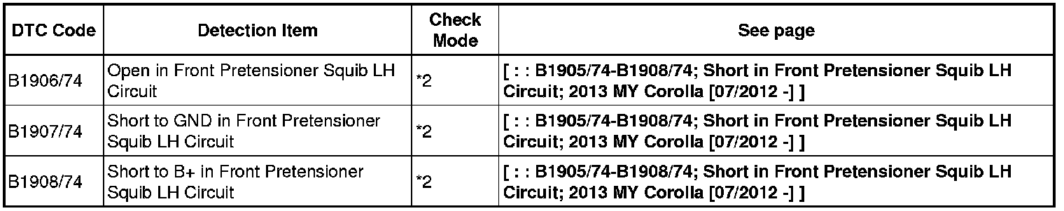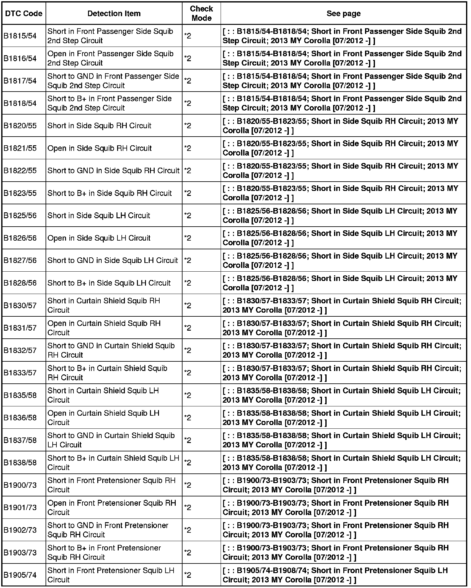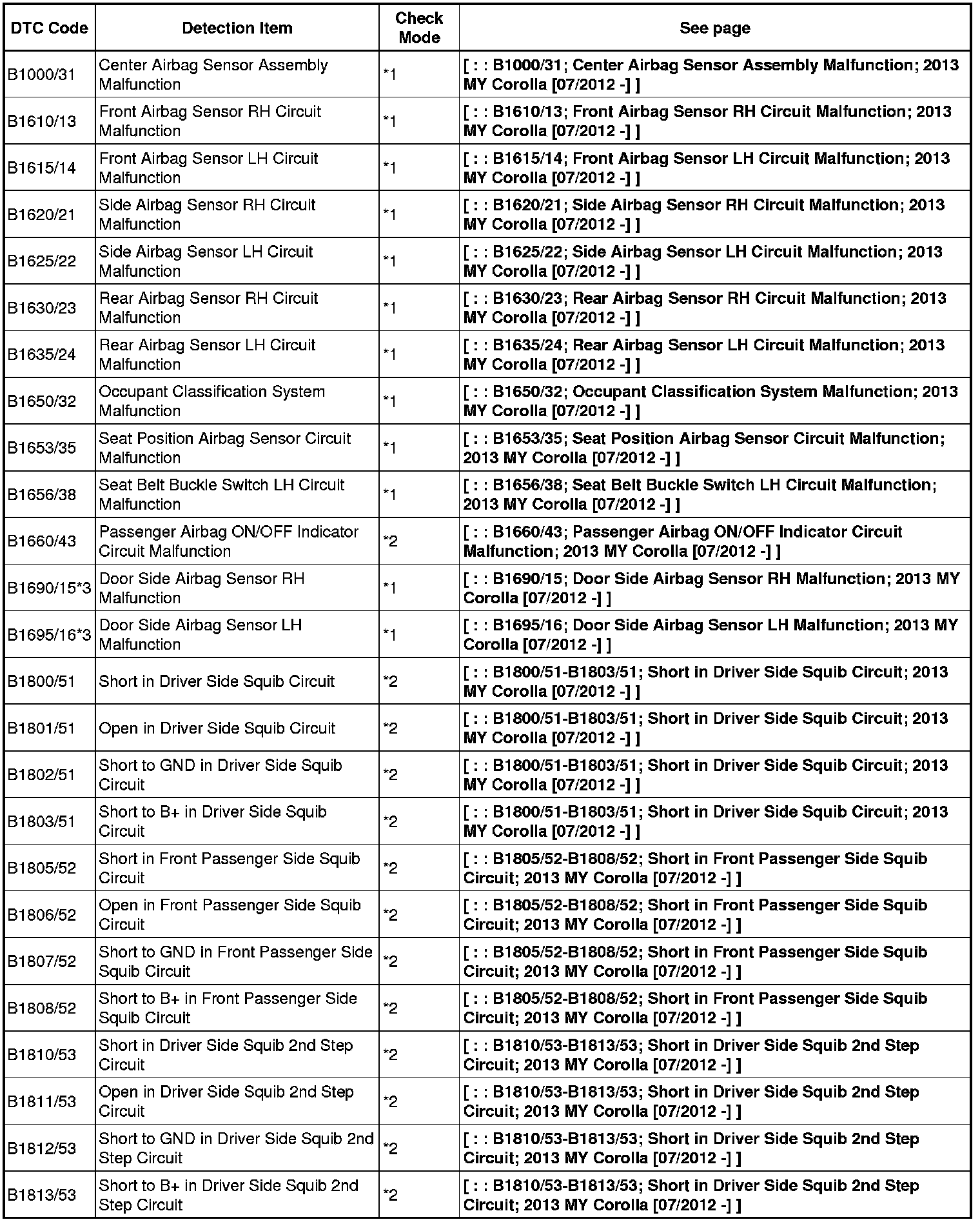 SUPPLEMENTAL RESTRAINT SYSTEMS: AIRBAG SYSTEM: DIAGNOSTIC TROUBLE CODE CHART; 2013 MY Corolla [07/2012 -]