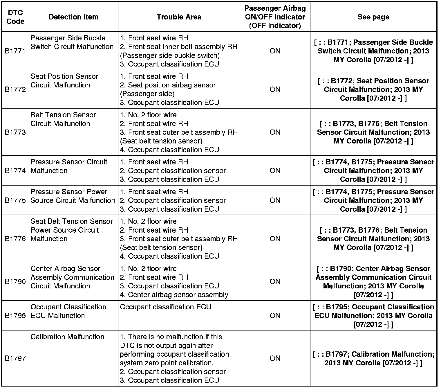 SUPPLEMENTAL RESTRAINT SYSTEMS: OCCUPANT CLASSIFICATION SYSTEM: DIAGNOSTIC TROUBLE CODE CHART; 2013 MY Corolla [07/2012 -]