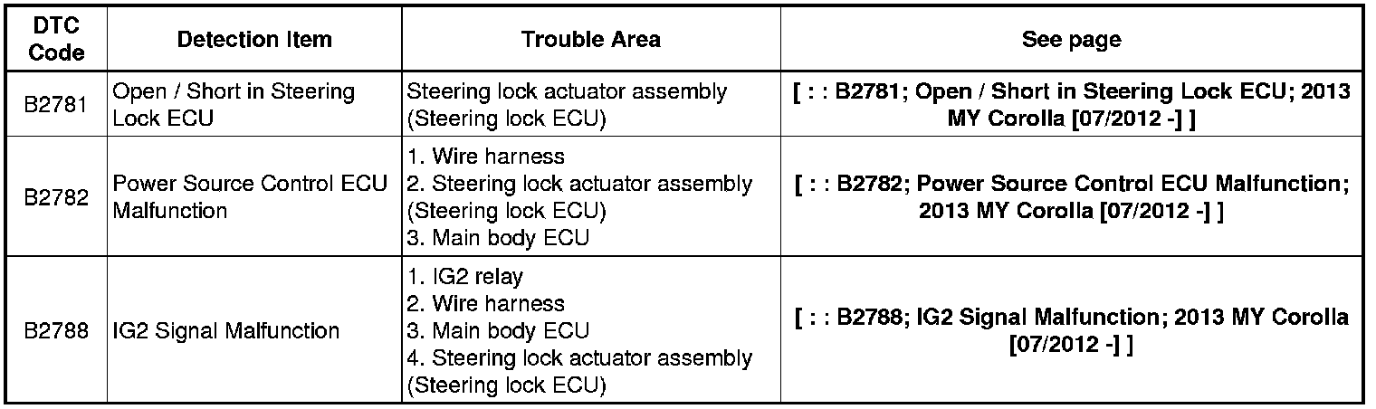 STEERING COLUMN: STEERING LOCK SYSTEM: DIAGNOSTIC TROUBLE CODE CHART; 2013 MY Corolla [07/2012 -]