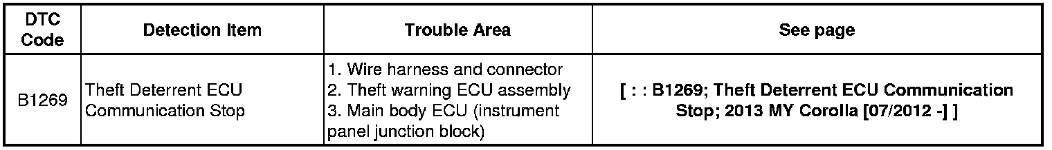 THEFT DETERRENT / KEYLESS ENTRY: THEFT DETERRENT SYSTEM: DIAGNOSTIC TROUBLE CODE CHART; 2013 MY Corolla [07/2012 -]