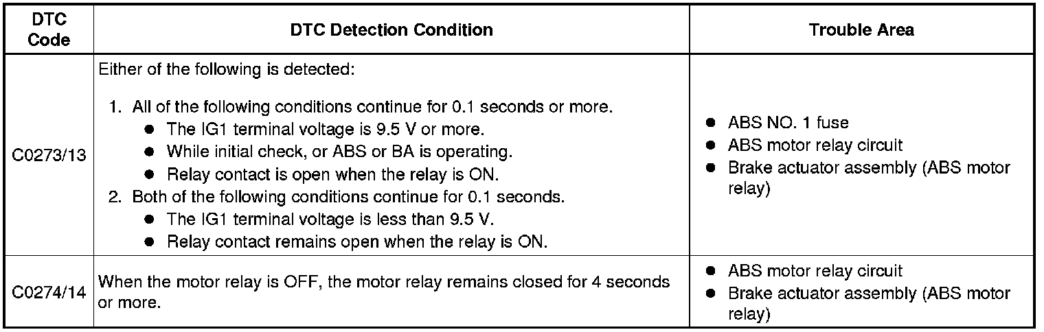 BRAKE CONTROL / DYNAMIC CONTROL SYSTEMS: ANTI-LOCK BRAKE SYSTEM: C0273/13, C0274/14; Open in ABS Motor Relay Circuit; 2013 MY Corolla [07/2012 -]