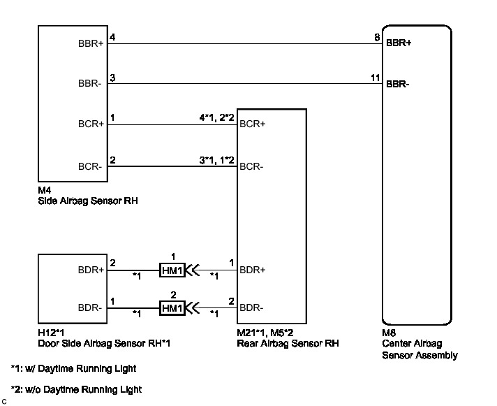 The rear airbag sensor RH circuit consists of the center airbag sensor assembly, side airbag sensor RH, door side airbag sensor RH* and rear airbag sensor RH.