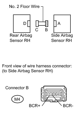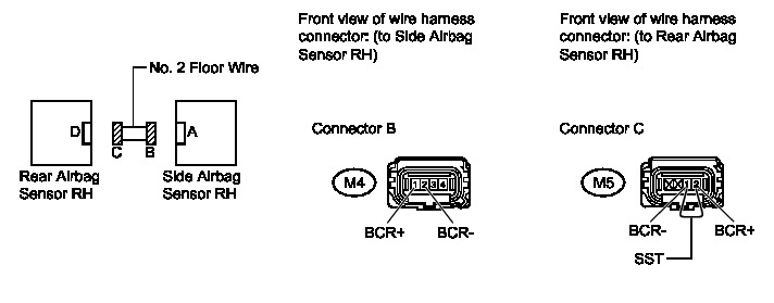 (c) Check that the connectors are properly connected to the side airbag sensor RH, door side airbag sensor RH and rear airbag sensor RH. Also check that the connectors that link the No. 2 floor wire and front door wire RH are properly connected.