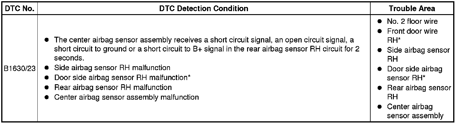 SUPPLEMENTAL RESTRAINT SYSTEMS: AIRBAG SYSTEM: B1630/23; Rear Airbag Sensor RH Circuit Malfunction; 2013 MY Corolla [07/2012 -]