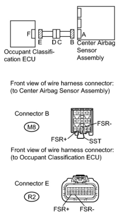 The occupant classification system circuit consists of the center airbag sensor assembly and the occupant classification ECU.