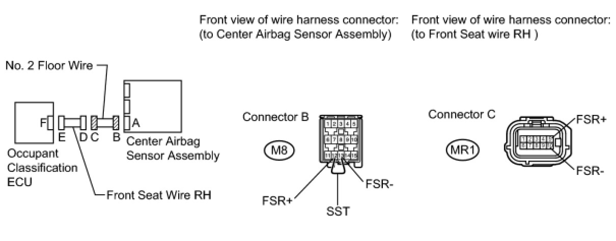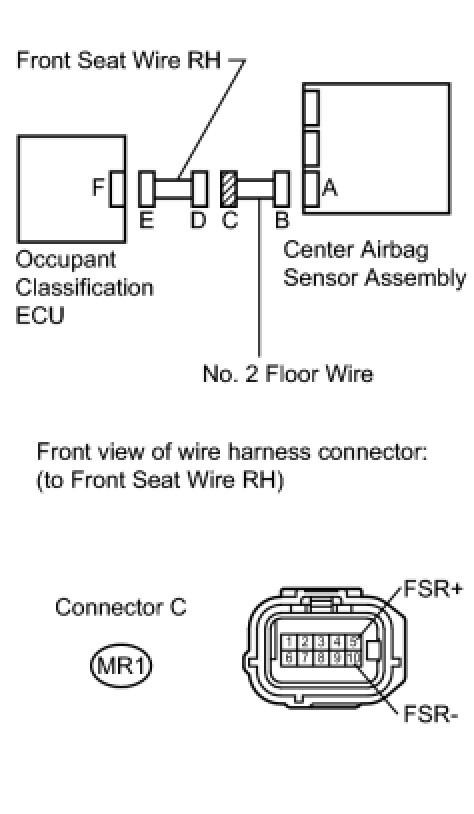 (c) Check that the connectors are properly connected to the center airbag sensor assembly and the occupant classification ECU. Also check that the connectors that link the front seat wire RH and No. 2 floor wire are properly connected.